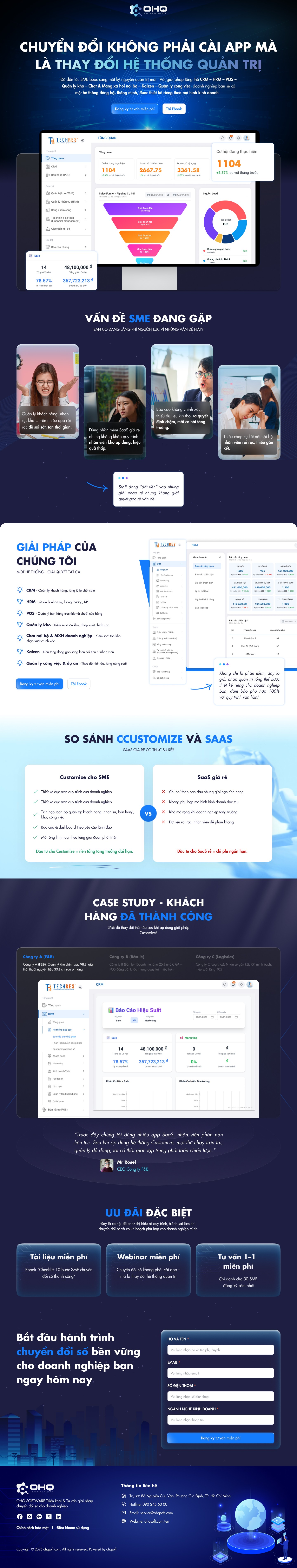 Trang landing page này dành cho giải pháp “Quản trị Tổng thể SME” nhằm hỗ trợ các doanh nghiệp vừa và nhỏ (SME) quản lý toàn diện — từ bán hàng, vận hành, nhân sự, chăm sóc khách hàng cho tới marketing & tài chính — thông qua một nền tảng tổng hợp. Mục tiêu là giúp SME giảm bớt gánh nặng quản lý thủ công, tiết kiệm chi phí và thời gian, đồng thời nâng cao hiệu quả vận hành & khả năng mở rộng.