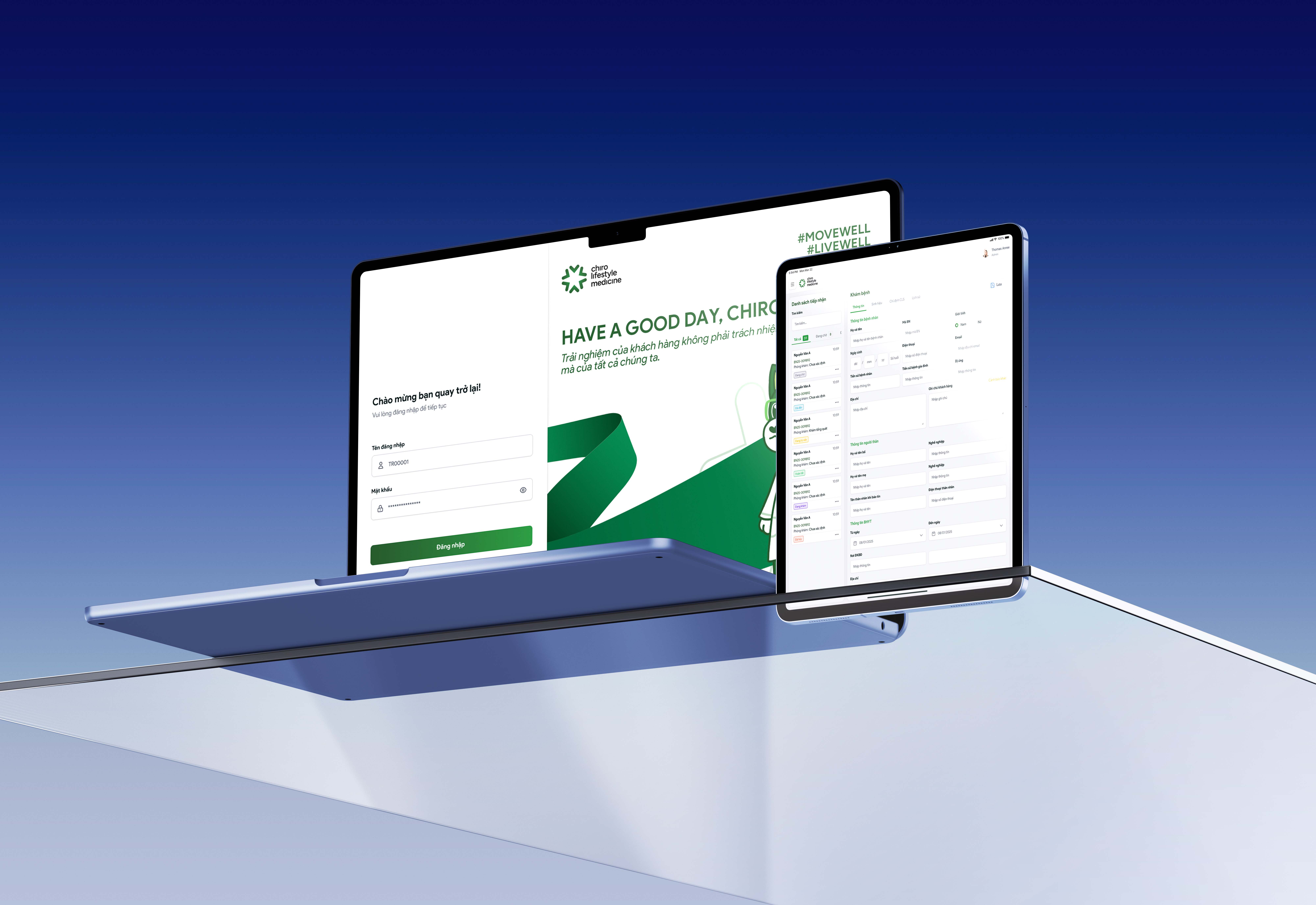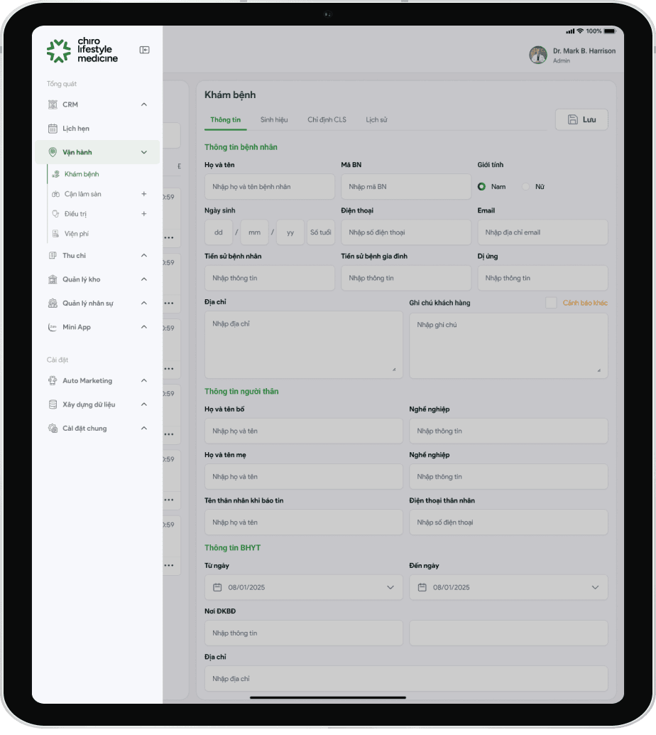 Chiro Lifestyle Medicine cung cấp giải pháp thiết kế và phát triển hệ thống quản lý phòng khám tùy chỉnh theo quy trình thực tế của từng cơ sở y tế, từ đặt lịch, tiếp nhận bệnh nhân, quản lý liệu trình đến chẩn đoán và theo dõi điều trị. Giao diện thân thiện, dễ sử dụng, hỗ trợ vận hành hiệu quả và nâng cao trải nghiệm bệnh nhân.