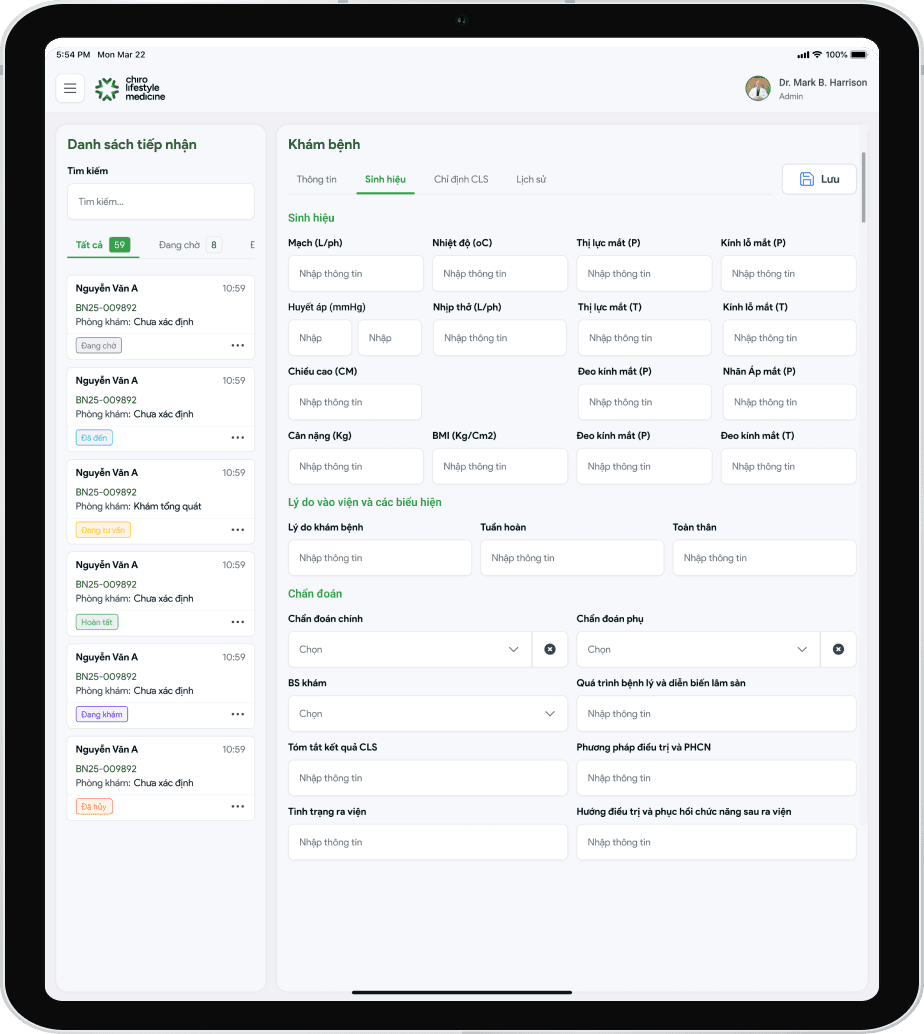 Tiếp nhận bệnh nhân: Tạo hồ sơ bệnh nhân nhanh chóng, đồng bộ thông tin và lịch sử khám chữa bệnh.